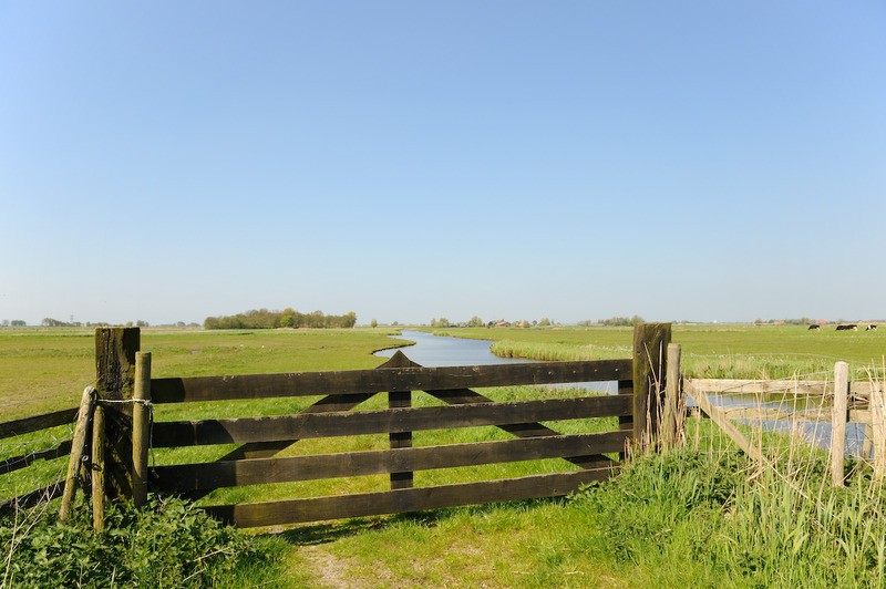 Bruin houten hek in weiland met uitzicht op het landschap.