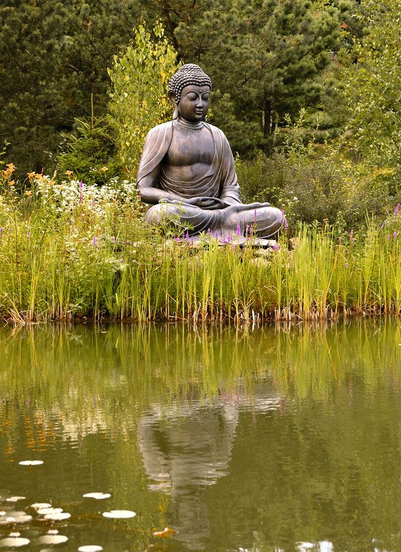 Buddha beeld in tuin met spiegeling in water.
