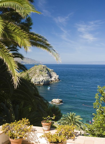 Tropisch uitzicht van Italiaanse zee met rotsen en palmen.